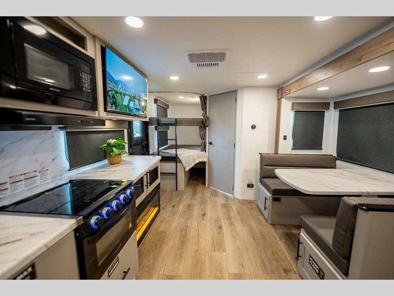 Sleeps 7 Slides 1 Length 31 ft 11 in Ext Height 11 ft Hitch Weight 689 lbs GVWR 8450 lbs Dry Weight 6295 lbs Fresh Water Capacity 45 gals Grey Water Capacity 82 gals Black Water Capacity 45 gals Number Of Bunks 2 Available Beds Queen Refrigerator Type 12V Refrigerator Size 10 cu ft Cooktop Burners 3 Shower Size 30" x 36" Number of Awnings 1 Water Heater Type On Demand Tankless TV Info LR 40" TV Awning Info 19' Axle Count 2 Shower Type Standard Solar Wattage 200 watts Similar Floorplans