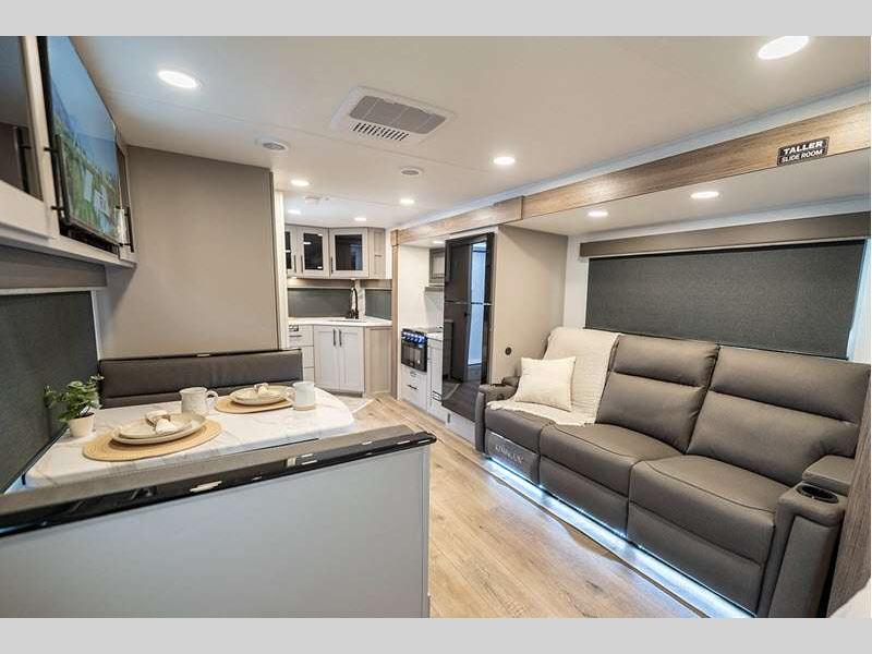 Exterior highlights include Step Above steps on all doors, Goodyear Endurance tires, exterior awning controls, and more. Inside, you'll enjoy fully functional oversized atrium windows, soft closet hidden hinges, and no carpet to make cleaning up easier than ever.