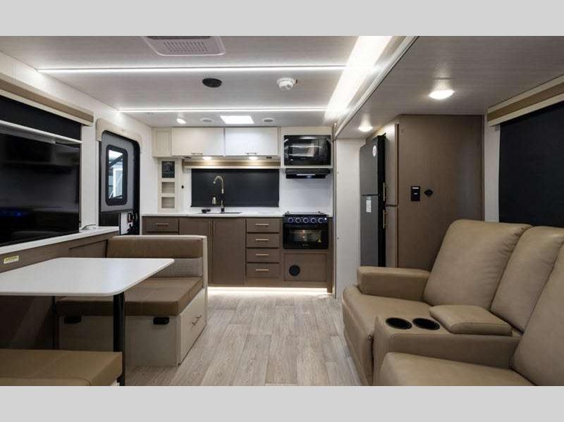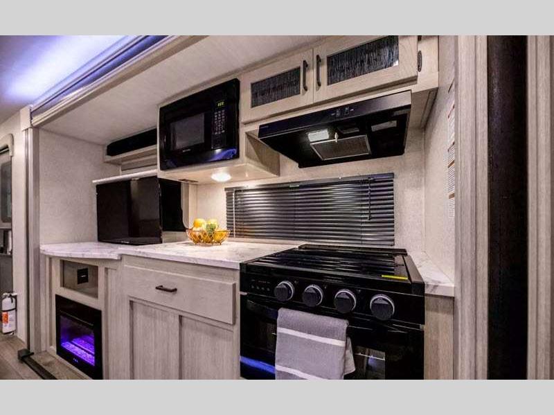 Sleeps 5 Slides 1 Length 28 ft 6 in Ext Width 8 ft Ext Height 11 ft 2 in Hitch Weight 805 lbs Dry Weight 6328 lbs Cargo Capacity 1457 lbs Fresh Water Capacity 53 gals Grey Water Capacity 60 gals Black Water Capacity 30 gals Furnace BTU 35000 btu Available Beds King Bed Refrigerator Type 12V Black Glass Refrigerator Size 10.7 cu ft Cooktop Burners 3 Shower Size 30" x 36" Number of Awnings 1 Water Heater Type On Demand Tankless AC BTU 15000 btu TV Info LR 50" Telescoping Awning Info 19' Power with LED Lights Axle Count 2 Shower Type Standard Similar Floorplans