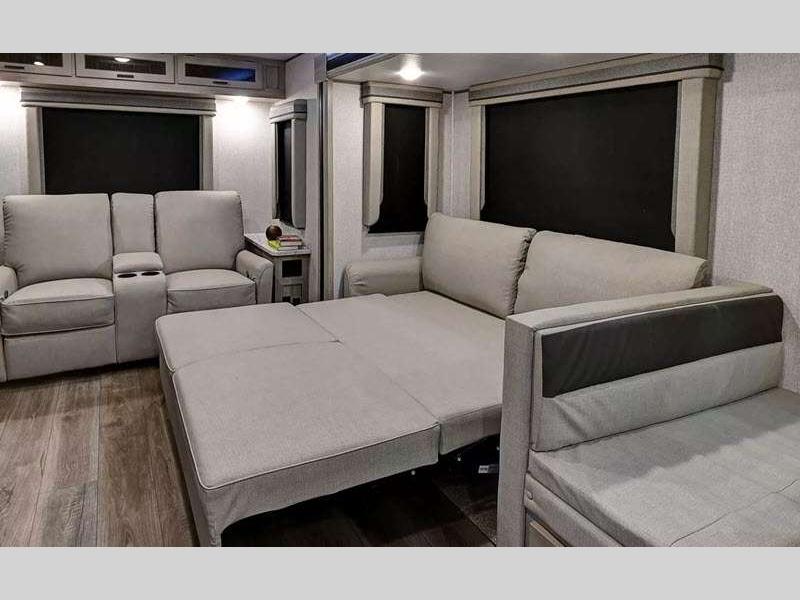 Sleeps 8 Slides 2 Length 37 ft 8 in Ext Width 8 ft Ext Height 11 ft 2 in Int Height 6 ft 9 in Hitch Weight 891 lbs Dry Weight 7911 lbs Cargo Capacity 3380 lbs Fresh Water Capacity 53 gals Grey Water Capacity 60 gals Black Water Capacity 30 gals Furnace BTU 35000 btu Number Of Bunks 2 Available Beds King Refrigerator Type 12V Black Glass Refrigerator Size 10.7 cu ft Cooktop Burners 3 Number of Awnings 1 Water Heater Type On Demand Tankless AC BTU 15000 btu Awning Info 21' Power With LED Lights Axle Count 2 Shower Type Radius Electrical Service 50 amp Similar Floorplans