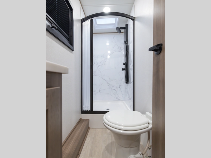 You'll love the bright interior, solid surface countertops and hardwood cabinet doors and drawer faces. There is a spacious shower and a tankless water heater for added comfort, and the 8,000W diesel generator plus 50 Amp service will keep you powered up. Outside, the 4-point hydraulic leveling will have you set up at camp in no-time, and there is a legless Girard awning with an LED light strip so you can relax outdoors in comfort.