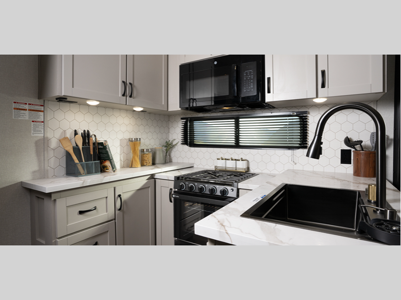 The Customer Value Package includes many features that will make life at the campground easier than ever, such as a tankless water heater, a Keyed-Alike lock system, a 12V refrigerator, and solar power. You will also appreciate the HappiJac bed system that will instantly transform your garage into sleeping space for guests!
