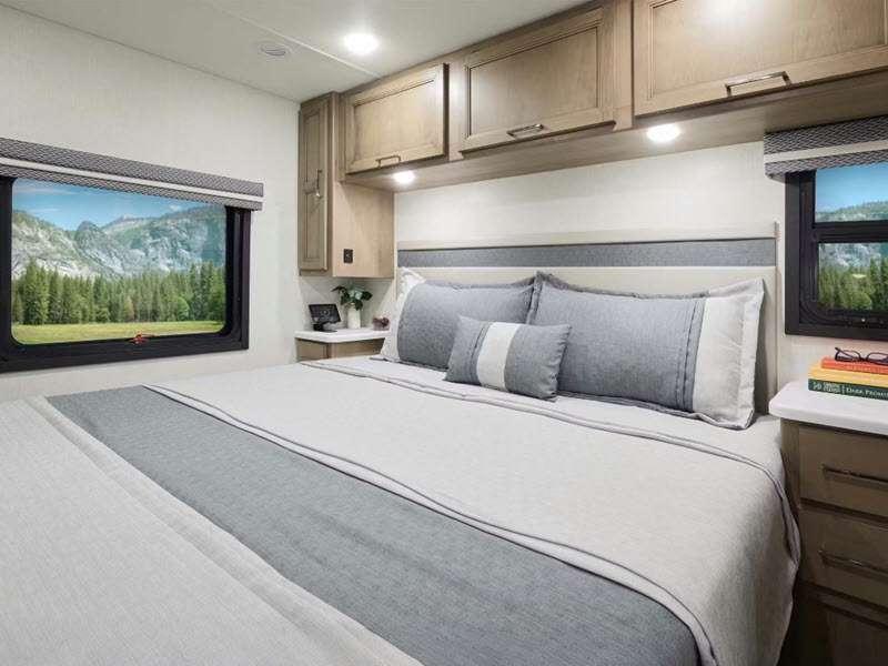 Sleeps 5 Slides 1 Length 30 ft 11 in Ext Width 8 ft 3 in Ext Height 12 ft 2 in Int Height 7 ft Interior Color Hilton Head, Nantucket Blue II Exterior Color Partial Paint; Granite Peak, Silverstone, Full Body Paint; Great Falls, Morning Rain Hitch Weight 8000 lbs GVWR 18000 lbs Fresh Water Capacity 50 gals Grey Water Capacity 40 gals Black Water Capacity 40 gals Tire Size 19.5" Furnace BTU 35000 btu Generator Onan RV QG 4000 Gas Fuel Type Gasoline Engine 7.3L V8 Chassis Ford F-53 Horsepower 335 hp Fuel Capacity 80 gals Wheelbase 190 in Number Of Bunks 1 Available Beds King Torque 468 ft-lb Refrigerator Type Residential Double Door Stainless Cooktop Burners 3 Shower Size 24" x 36" Number of Awnings 1 LP Tank Capacity 88 lbs Water Heater Type Tankless Basement Storage 69 cu. ft. TV Info LR 40" LED Smart TV, BR 32" Smart LED TV, Ext. 32" on Swivel w/ Bluetooth Awning Info 19' Power Patio with Integrated LED Lighting Gross Combined Weight 23000 lbs Shower Type Standard Electrical Service 50 amp Solar Wattage 100 watts Similar Floorplans
